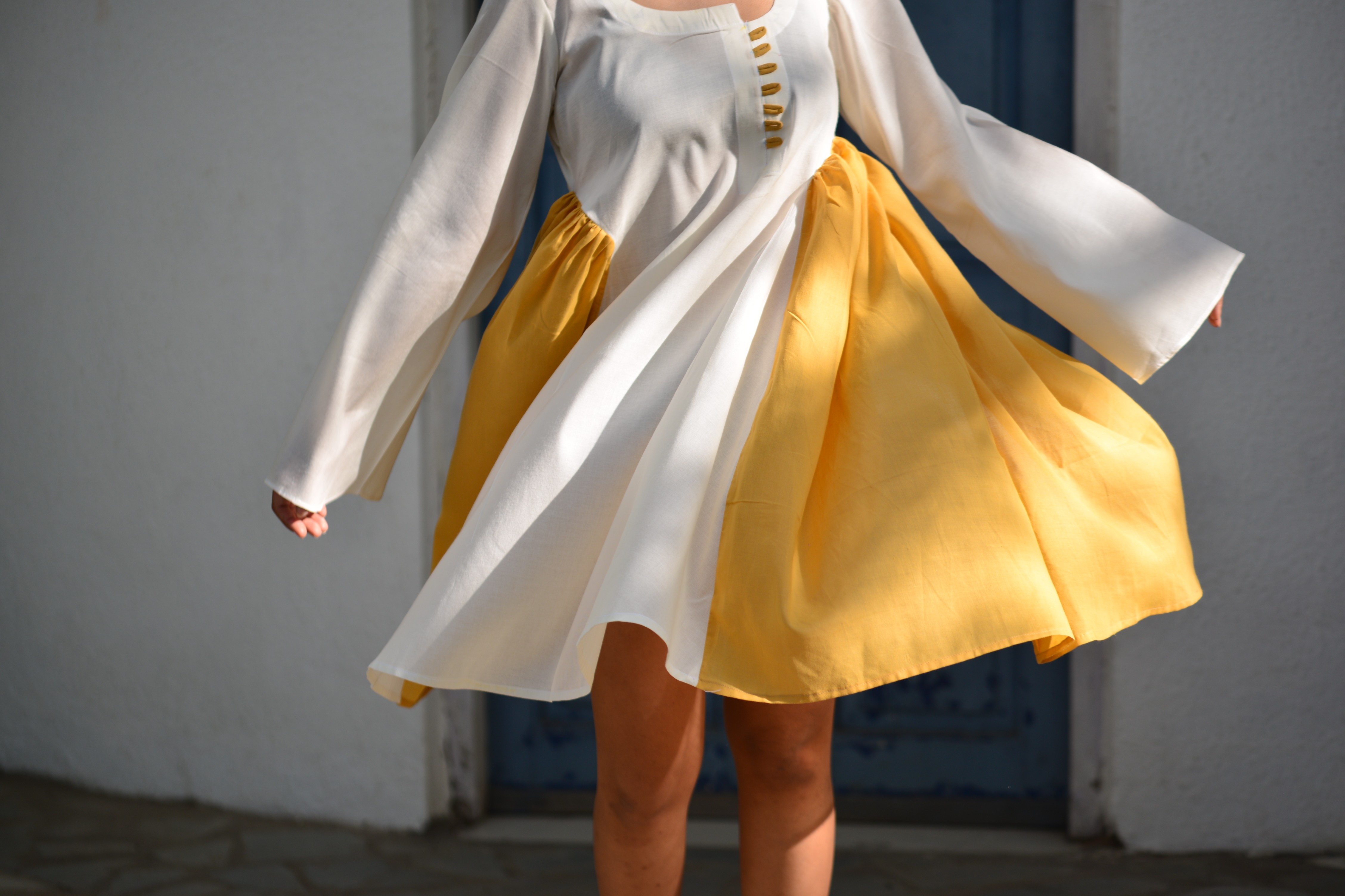 Flowy, lightweight, airy, summer dress that takes inspiration from the sun rays itself, giving it its name Suneheri (Golden).